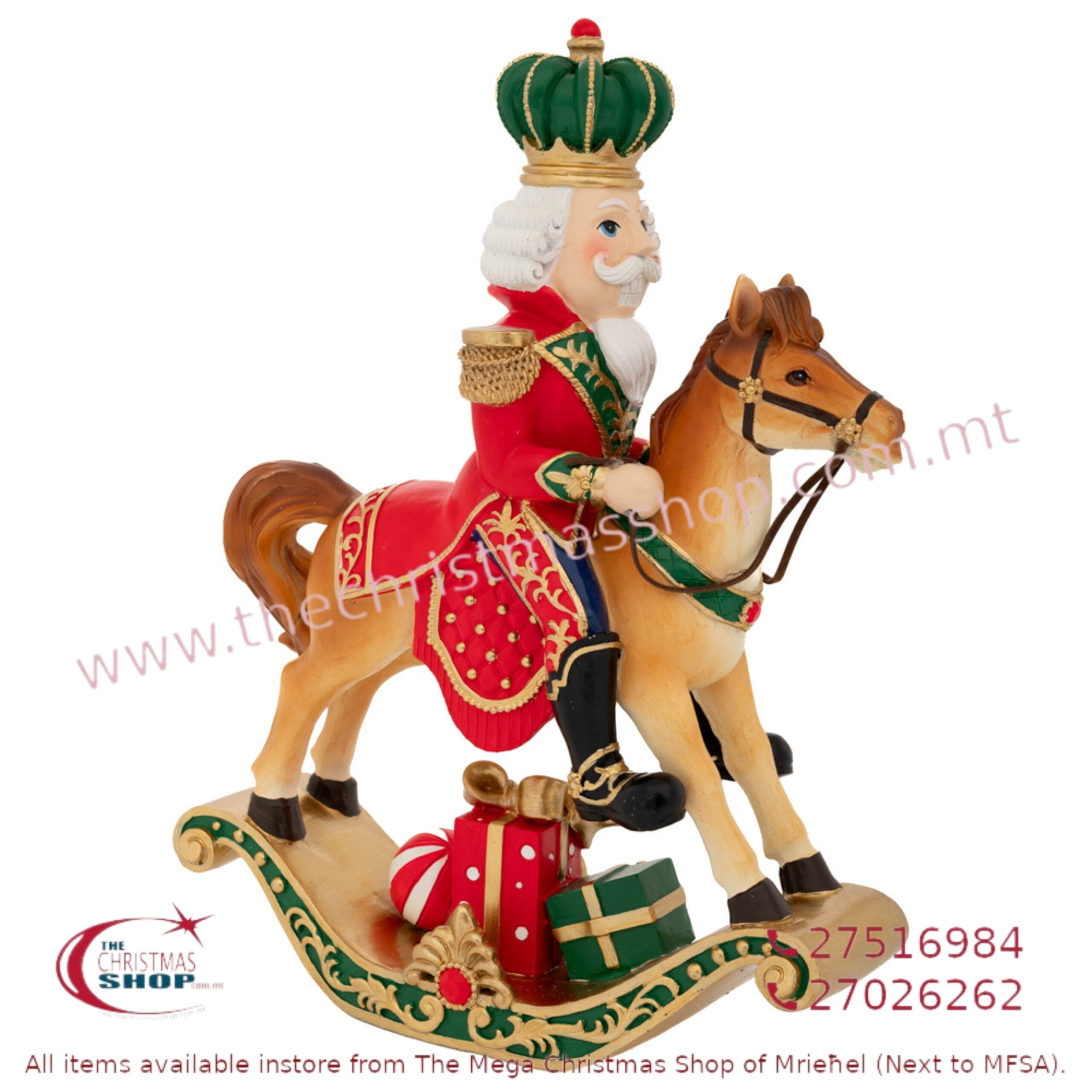 XMAS RED RESIN NUTCRACKER GIFTS ON VINTAGE ROCKING HORSE. IL903537